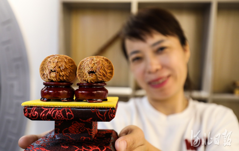 2020年9月22日,在張家口市涿鹿縣南將石村文玩核桃展館,工作人員展示雕刻的工藝文玩核桃。當(dāng)日,張家口市涿鹿縣謝家堡鄉(xiāng)南將石村舉辦了第二屆南將石文玩核桃節(jié),吸引來眾多京津冀地區(qū)的文玩核桃收藏家。涿鹿縣南將石村憑借一棵具有200多年歷史、華北地區(qū)唯一一棵被譽(yù)為“河北山核桃王”的野生文玩核桃樹,通過培育發(fā)展,現(xiàn)已形成占地500多畝,出產(chǎn)獅子頭、南將石、官帽、虎頭等多個(gè)品種的文玩核桃栽植基地,并帶動(dòng)了當(dāng)?shù)剞r(nóng)民的增收。